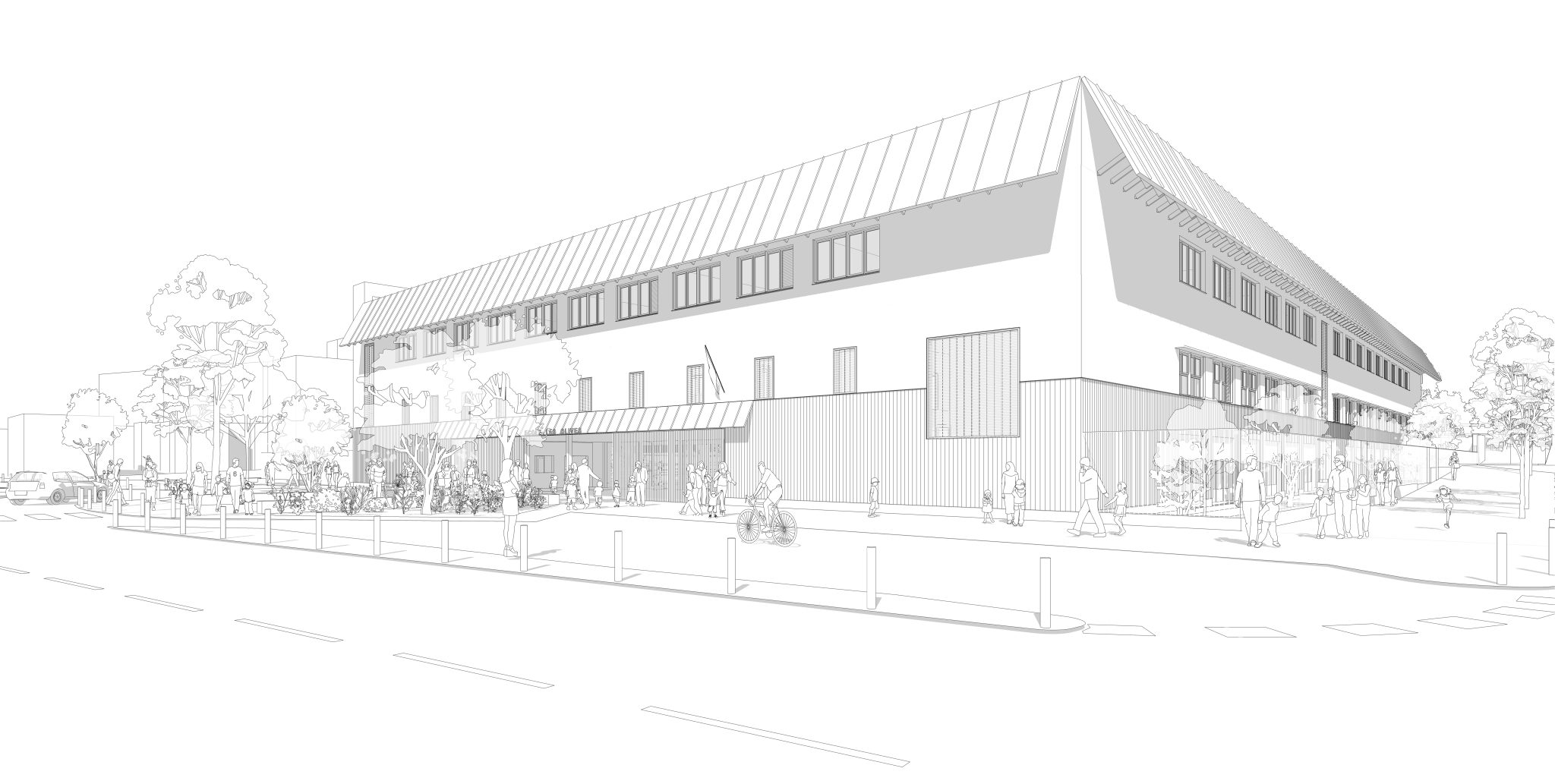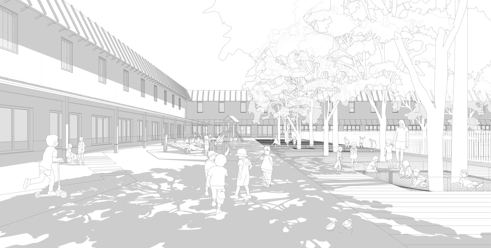 Il y a dans ce dessin la volonté de conserver les arbres mâtures en présence et de créer une relation forte entre la vie de l’école et la cour. Le rythme régulier de sa forme contraste avec le mouvement organique et foisonnant des jardins. Les espaces extérieurs en pleine terre sont généreux pour transposer en extérieur toutes sortes d’activités d’apprentissage. La nature est changeante, cette impermanence est révélée jusque dans la construction par le traitement de la lumière naturelle en fonction des différentes orientations et par une relation de complicité avec la végétation extérieure. L’écriture architecturale du bâtiment est calme et douce, alliance de matériaux simples et naturels. Le nombre de matériaux utilisés est limité. Les dispositifs architectoniques mis en œuvre sont guidés par la recherche du meilleur équilibre entre coût, contraintes de chantier, impact carbone et disponibilité des ressources locales. Sur un corps en béton très optimisé, préfabriqué, et radical dans ses trames, se lit une enveloppe en Mur à Ossatures Bois, intégralement biosourcée, également rationnalisée et préfabriquée. Le parti bioclimatique vise à assurer un confort optimal aux élèves et aux enseignants en toutes saisons.