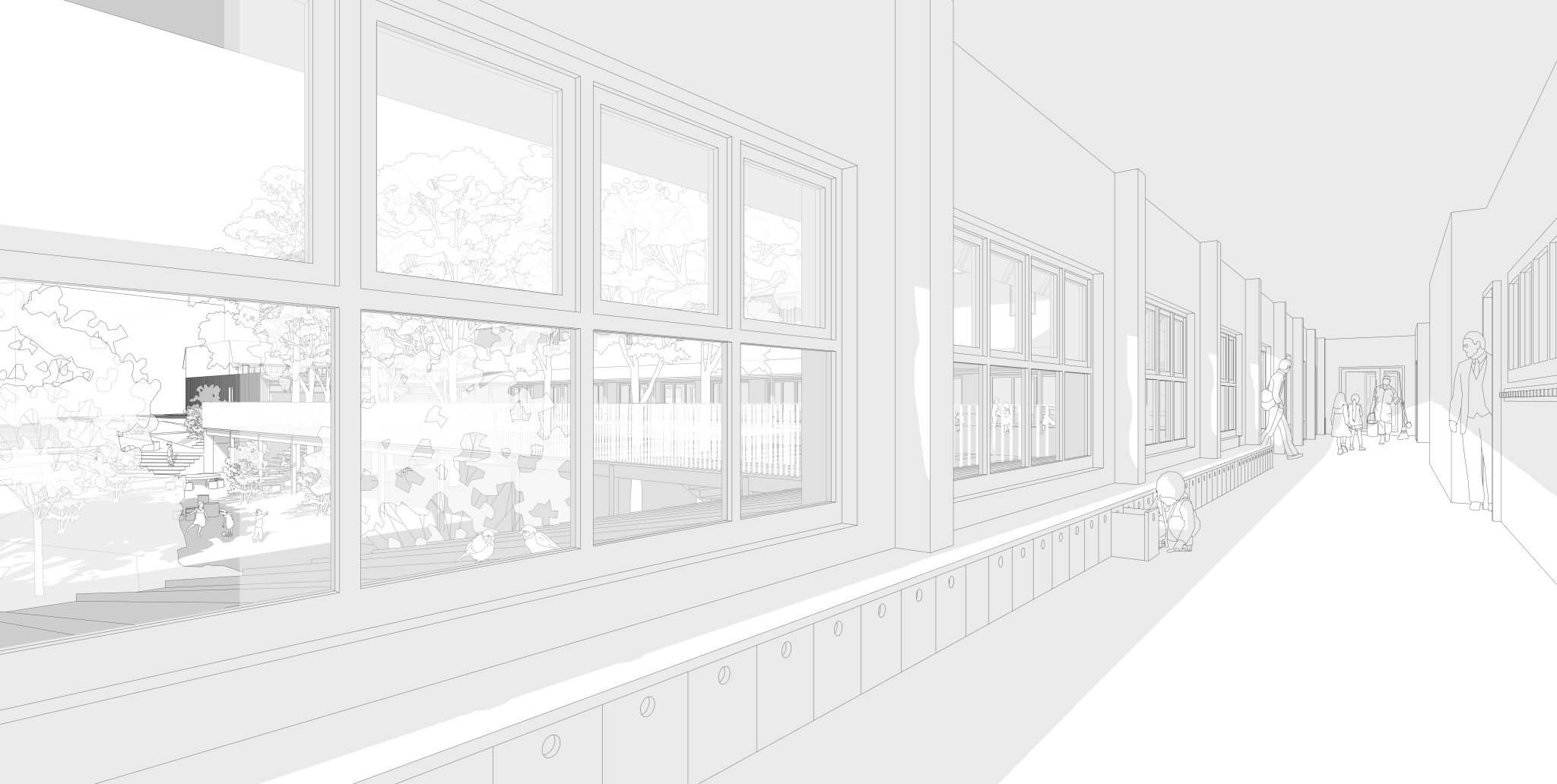 Sous des habits humbles, aux lignes épurées, le volume construit forme l’enceinte protectrice d’un lieu intériorisé et foisonnant. Frontière physique entre l’agitation de la ville et le monde des enfants, l’école se développe en U autour d’une grande cour centrale.